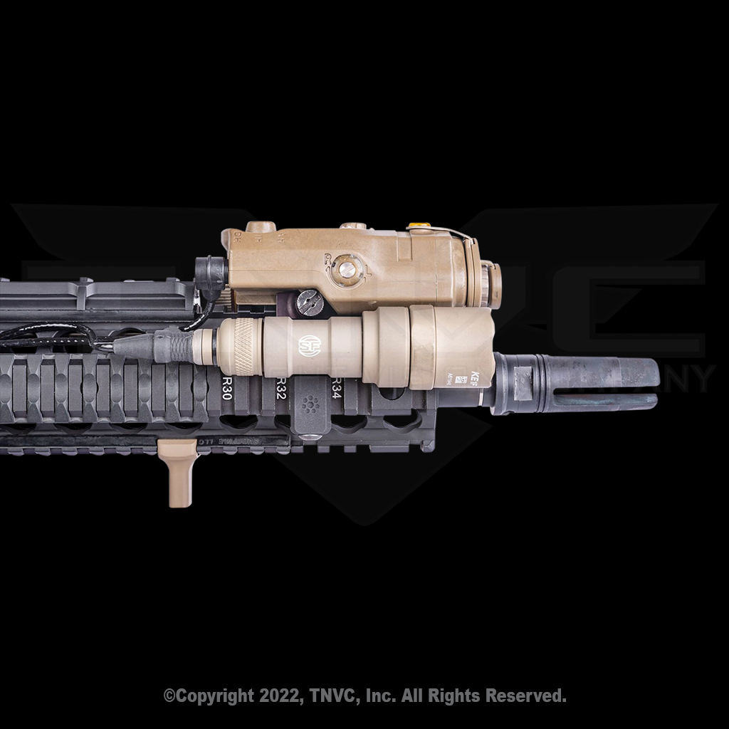 The Patent Pending Arisaka Side Scout Mount (SSM) is designed for use with Surefire Scout Lights, the Modlite PLH and OKW weapon lights, the Arisaka 300, 600 and 18650 Series, and the Streamlight Protac Rail Mount lights. It replaces the stock Picatinny rail adapter with a low profile mount that tucks the light underneath either side of the ATPIAL laser/illuminator series, including the ATPIAL-C, AN/PEQ15, and LA-5/PEQ. It will also allow the light to clear the QD lever on the Steiner DBAL I2, A3, and D2.