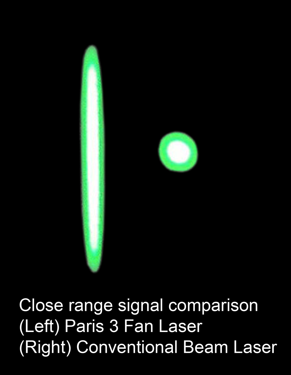 At close ranges the Paris 3 laser can also be superbly effective as a signaling /warning device. On the battlefield, beam lasers have been deployed at check points to warn off approaching vehicles. At 1000 feet focusing a spot laser on a moving automobile windshield can be challenging. Conversely the Paris 3 fan laser will project a fifty+ foot line at this range dramatically increasing the probability that the signal will be recognized.