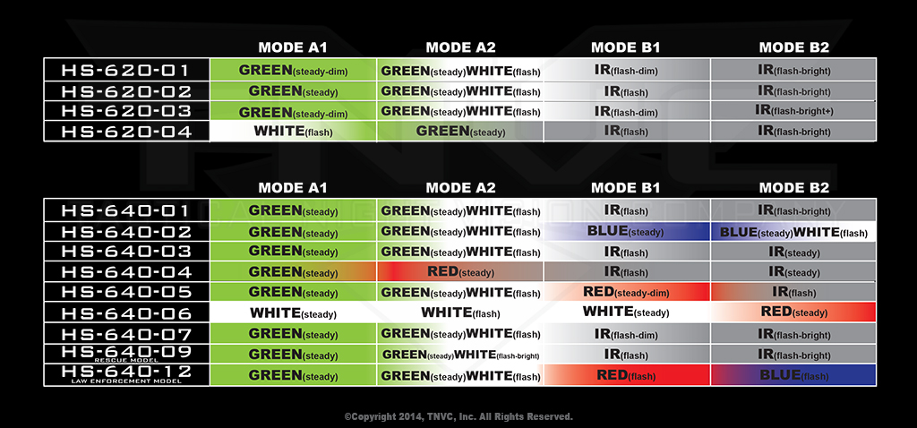 There are two series of HEL-STAR 6: 620 and 640.  The 620 features a lock clip in the nose that requires a tool for  removal.  When the arrow on the clip is facing the nose, the HEL-STAR 620 will be locked into two functions.  The clip must be pried up, flipped and replaced to switch to the other two functions.  This provides extra security for the user so that he/she can choose either Overt Visible or Infrared functions only, eliminating the possibility of accidentally flashing a visible strobe in the field.