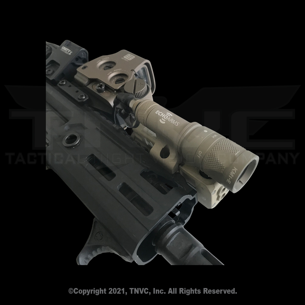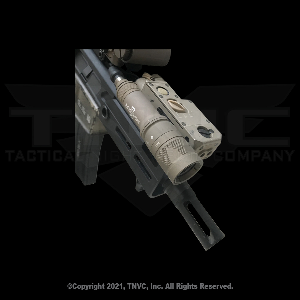 The low profile, one-piece body design closely hugs the CQBL-1, giving users a complete IR/VIS Aiming Laser and integrated weapon light – when combined with a dual spectrum light like the Surefire M3xxV family, the ECHO Arms CQBL ILM gives the user complete IR AIM/ILLUM and VIS AIM/White Light capabilities in a compact package that is less than 4.5″ long, 6.3″ wide, and 1.4″ tall, making it ideal for PDW, SMG, and PCC applications where rail space and accessory mounting and integration space is extremely limited.
