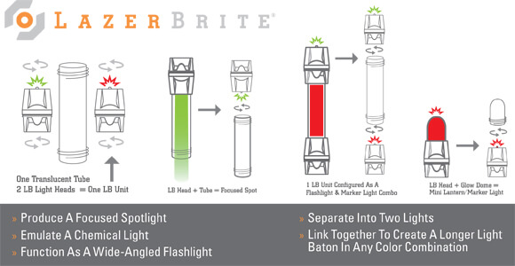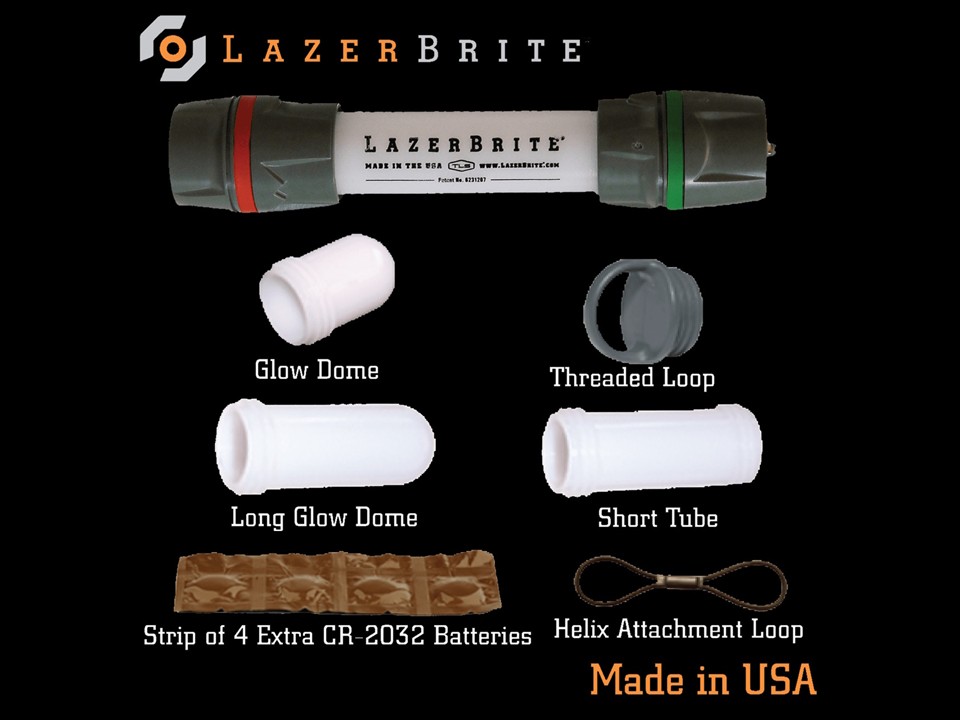This kit includes extra batteries, a long and short glow dome, a short tube, a threaded loop, and a helix attachment loop. The batteries have a ten-year shelf life and the light itself can last continuously for several days. The glow domes can be screwed into the top of the flashlight heads to create an LED lantern. The threaded loop and helix attachment loop can be use to tie the LazerBrite heads to various objects, such as bike handlebars, walking sticks, tree branches, and can even keep it suspended inside a tent.