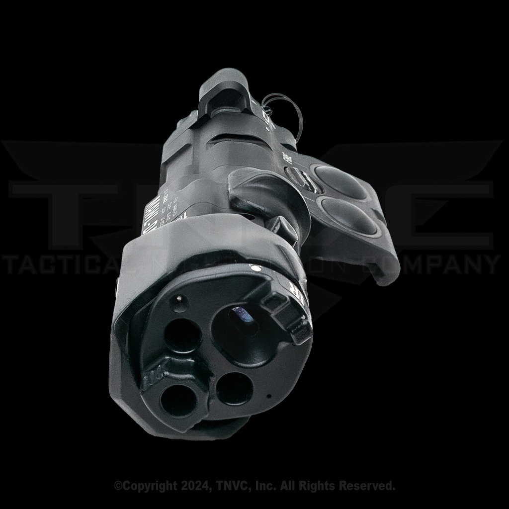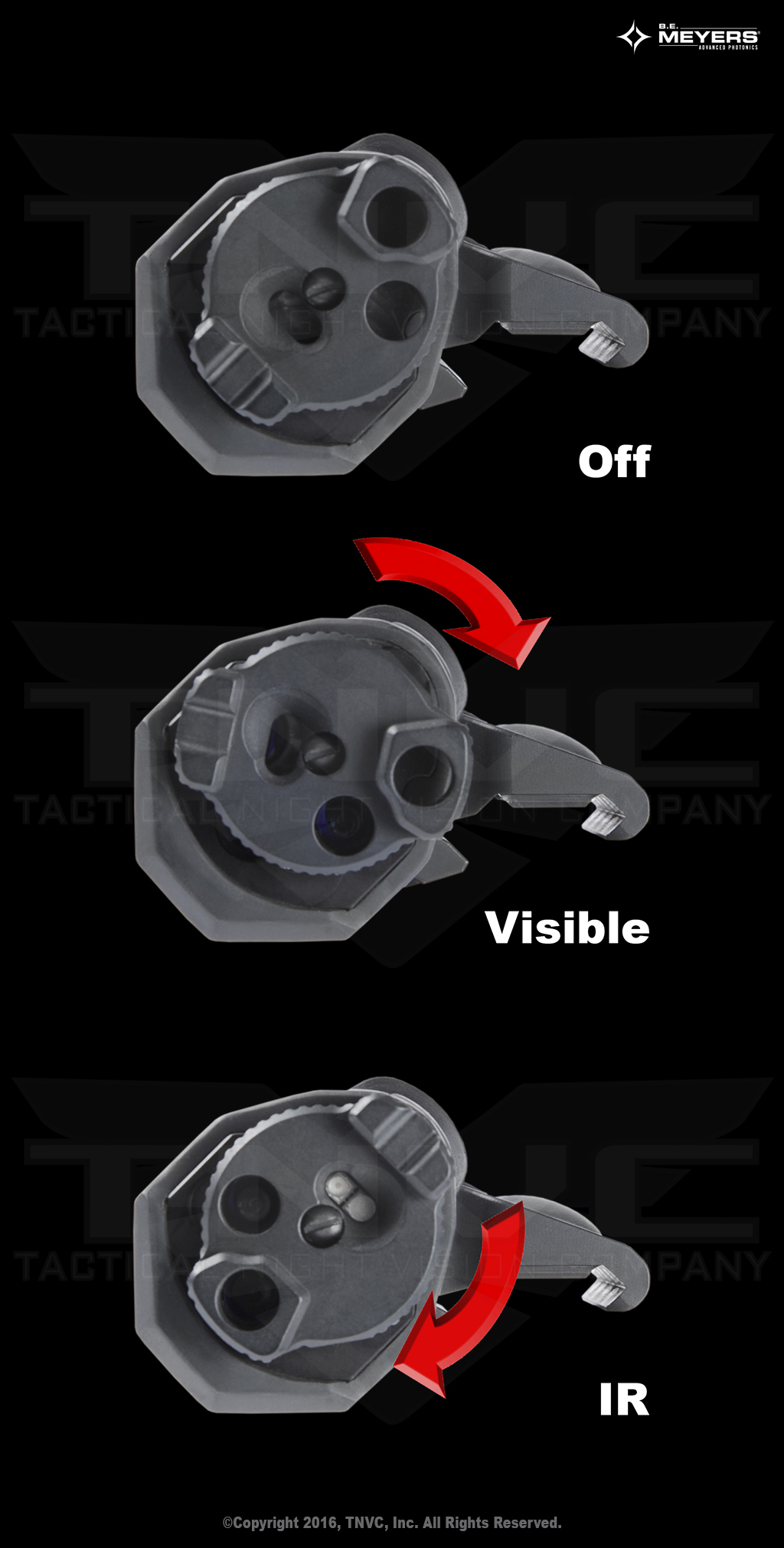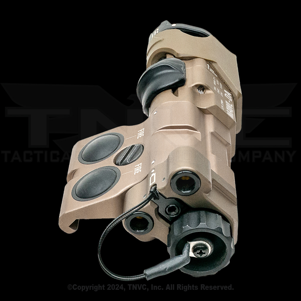 Controls are incredibly intuitive.  Output modes are switched by rotating the front bezel to expose the appropriate emitter.  OFF = all emitters covered.  VIS = Only Visible Green emitter exposed.  IR = Only IR Laser Pointer and IR Laser Illuminator emitters exposed.  Onboard controls include two “fire” buttons (“A” and “B”) that control the illuminator beam divergence and pattern. The beams are pre focused to optimal FOV and power at various power outputs.  Output power control is accomplished with a top-mounted tactile sliding switch.  The switch output mode is easy to determine through feel and has three positions for “SHORT,” “MID,” and “LONG” range modes.  This means there is no fumbling through complex dial adjustments around the clock in the dark.  Everything is rapid and effortless!  B. E. Meyers has continued to integrate end-user and operational feedback to improve the functionality of the MAWL, with the addition of two more functions using a “Triple Click” beginning in 2021 and several revisions to the beam divergence and output to continue to make the MAWL one of the most intuitive and functional lasers available on the market.