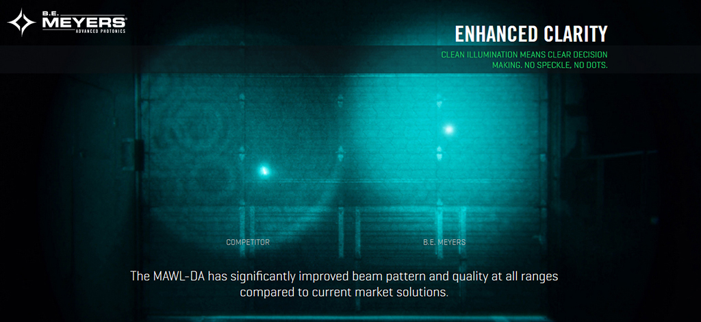 The B.E. Meyers MAWL-DA represents a true paradigm shift in laser system design.  It is a full featured infrared and visible green aiming and illumination laser for individual carbines.  Offering improved ergonomics, interface, and performance, the MAWL-DA was designed from the ground up around the evolved needs of the warfighter.