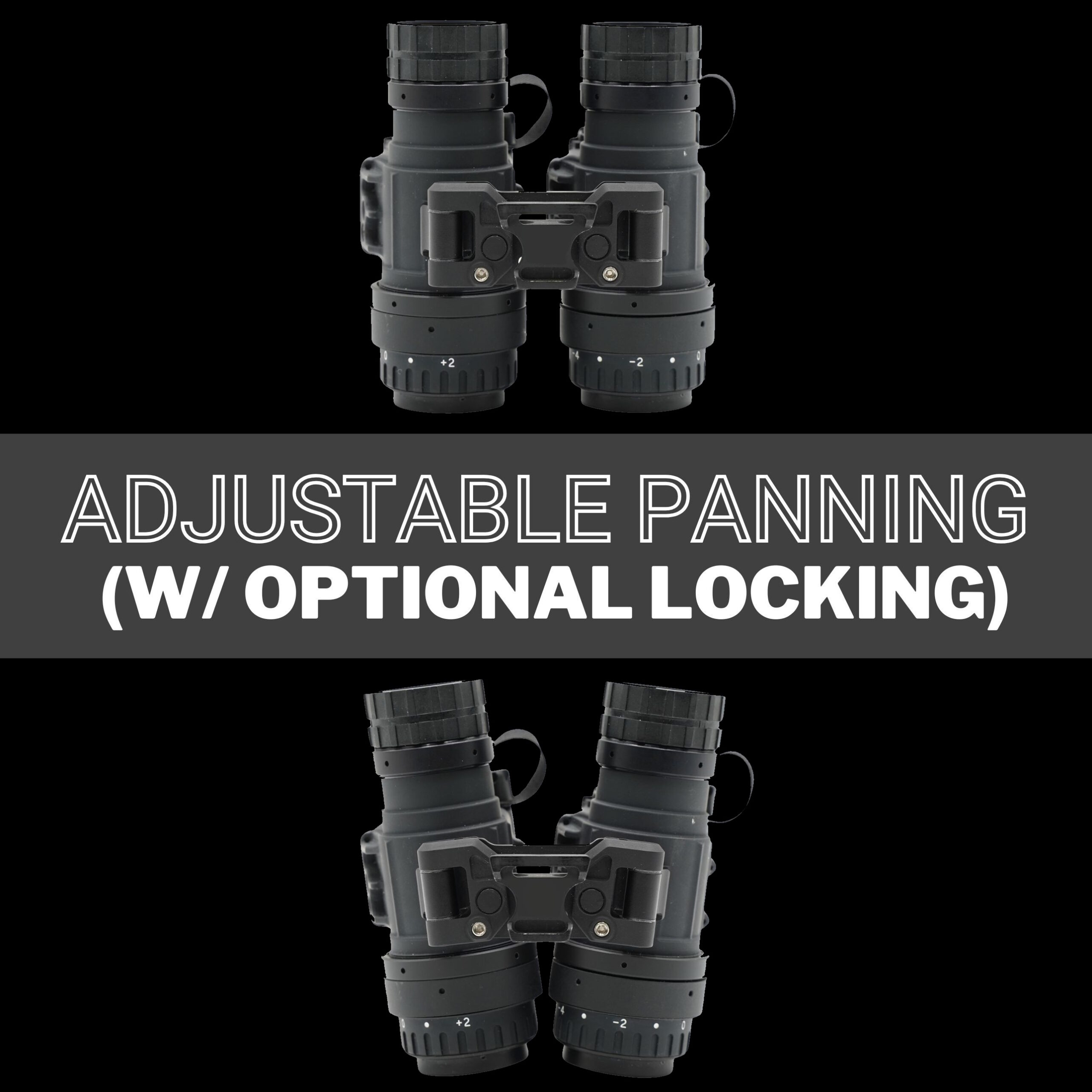 PANOBINO offers on-the-fly pan angle adjustment with the ability to individually lock each side, extreme rigidity, and bulletproof durability. To adjust the pan angle, simply grab one arm and firmly rotate the friction-based mechanism. To mechanically lock an arm at the chosen pan angle, take a 3/32″ hex wrench or the 3/32″ bit from the included NVAT (Night Vision Accessory Tool) and tighten the top-mounted set screw.