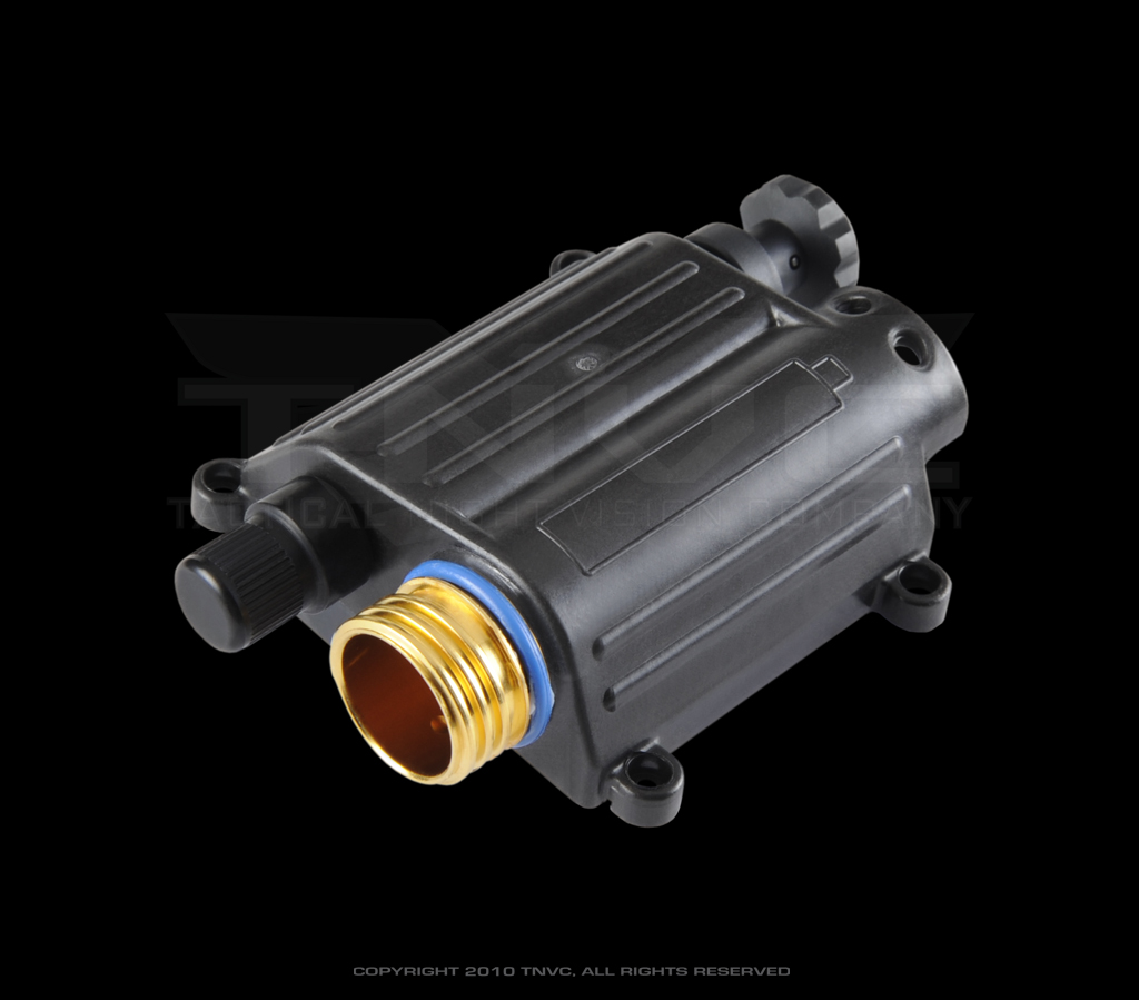 The PVS-14 Single AA Battery Housing Assembly is a drop-in replacement unit. It includes a Printed Circuit Board, Flex Cable Sockets, and Tube Connector Sockets for connecting to the Image Intensifier Tube. The outer assembly includes the On/Off Switch and Gain Adjustment Knob.