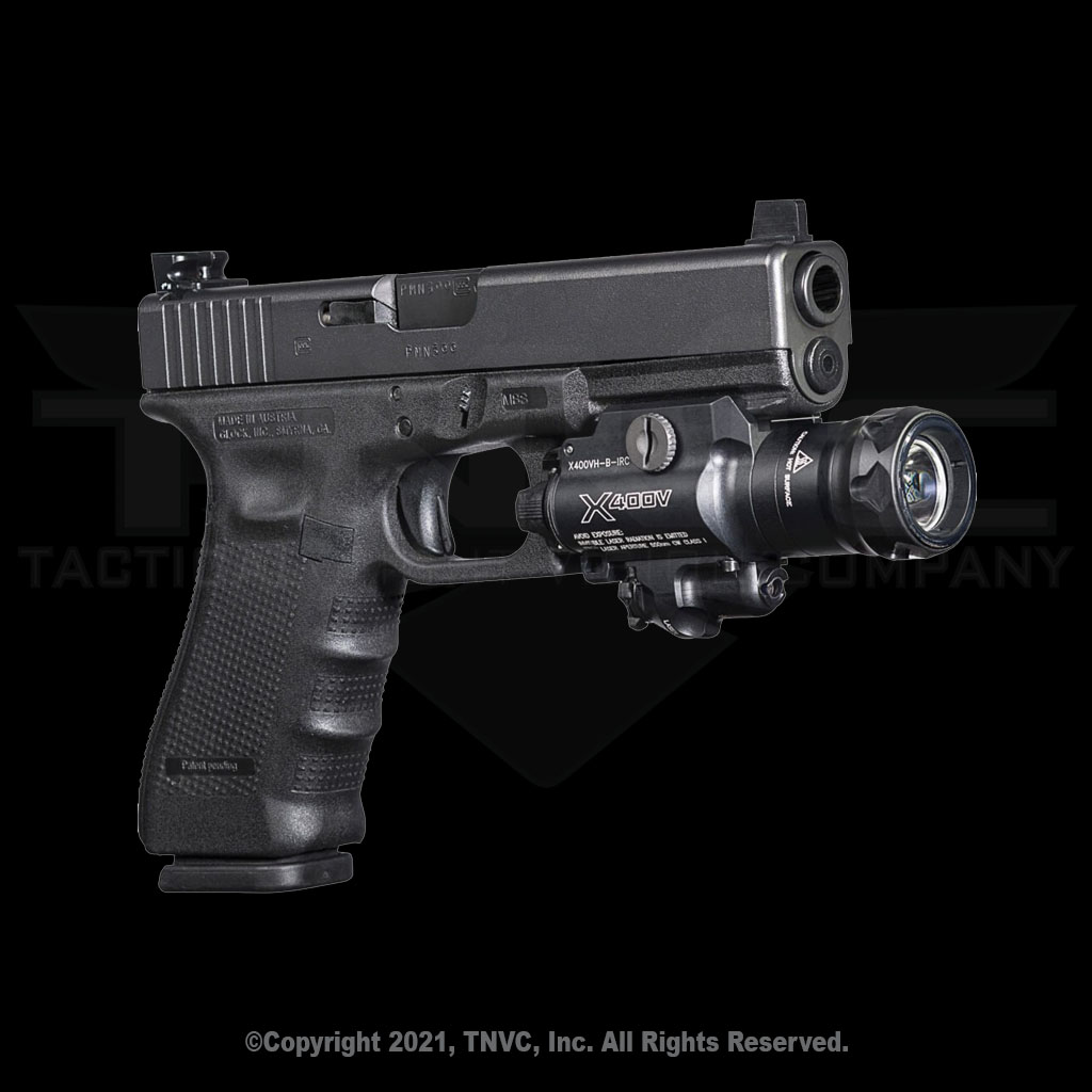 Keep your whereabouts in the dark with the X400VH, which integrates with SureFire’s revolutionary MasterFire® Rapid Deploy Holster for quick deployment and instant-on light activation, an ideal combination in a low-light, high-stress situation. Even better, the X400VH features our innovative V-Series head, which provides both white-light and infrared illumination, plus an integral Class 1 infrared laser aiming device. Choose between 350 lumens of visible, tactical-level light or twist the bezel’s self-locking selector to switch to generate 120 mW of IR illumination for use with NVGs. The infrared laser provides a highly visible dot for aiming during stealth operations where focusing on iron sights with NVGs can be challenging. When it comes to sheer mission/weapon compatibility the X400V dominates in the dark.