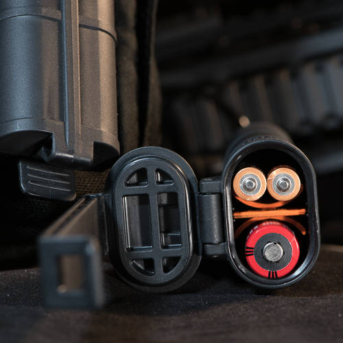 The CellVault XL’s internal divider can keep CR123 batteries inside secure even when the CellVault XL is inverted. Just squeeze the front and back of the tube to release CR123s.
