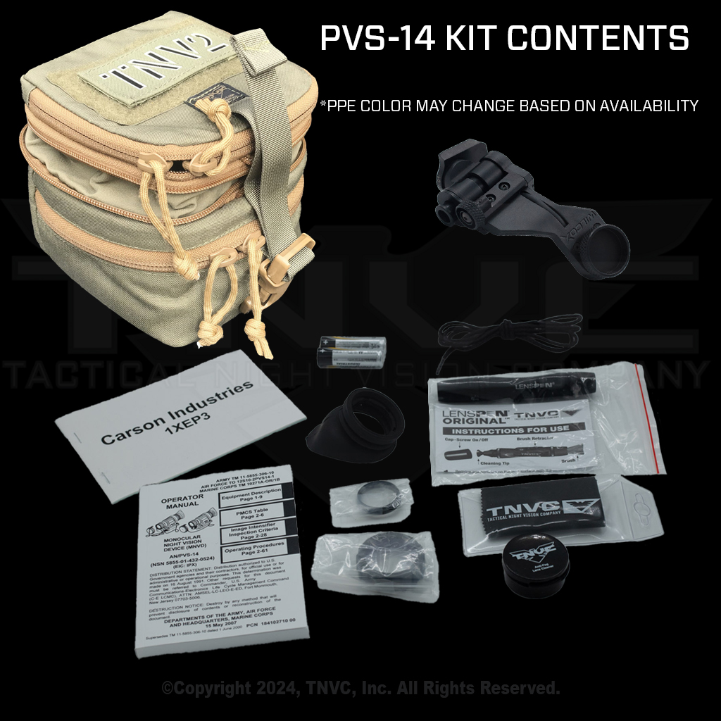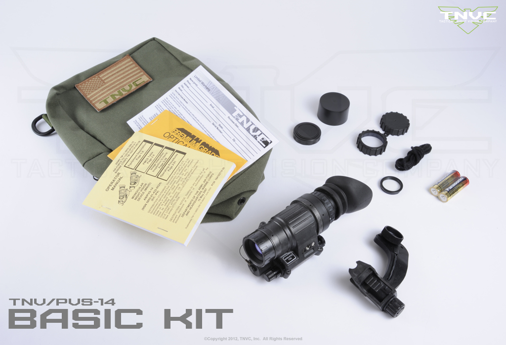 | Basic Kit | TN/PVS-14, USGI bayonet horn j-arm, Rubber Eye Cup, Daylight Filter, Sacrificial Window, Demist Shield, Neck Cord, Soft Carry Case, Two (2x) AA Batteries, Lens Cleaning Tissue, Military Maintenance Standards, Warranty Registration |