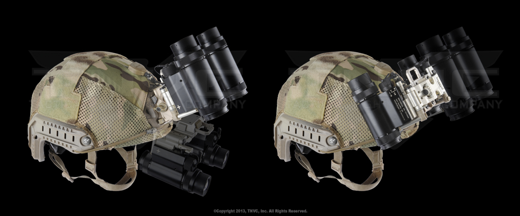 The Bridge System interfaces with standard Wilcox dovetail mounts such as the popular G24. It allows the individual monoculars to be rotated out of the way, giving operators the option to run their binocular system like a monocular system. Or, if they choose, both tubes can be pivoted up out of the way instead of flipping the goggle mount up. Another benefit of this feature is the ability to lay the goggle flatter against the helmet shell surface when it is flipped up. This is a huge boon to operators who know how obtrusive a flipped-up goggle can be. By pivoting the tubes flat against the helmet, the operator’s head is lower profile, greatly decreasing the possibility of damaging the goggles or getting hung up on an obstacle.