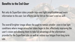 Manufactured by L3Harris and distributed by TNVC, SuperGain Unfilmed White Phosphor image intensifier tubes increase the Luminance Gain (Gain) specification for image intensifier tubes from the standard 40,000-80,000 fL/fc to between 100,000-120,000 fL/fc greatly increasing the image intensifier’s ability to amplify and collect light, resulting in a noticeably brighter image with increased low light performance and extending operational envelope and ability to see into dark areas.